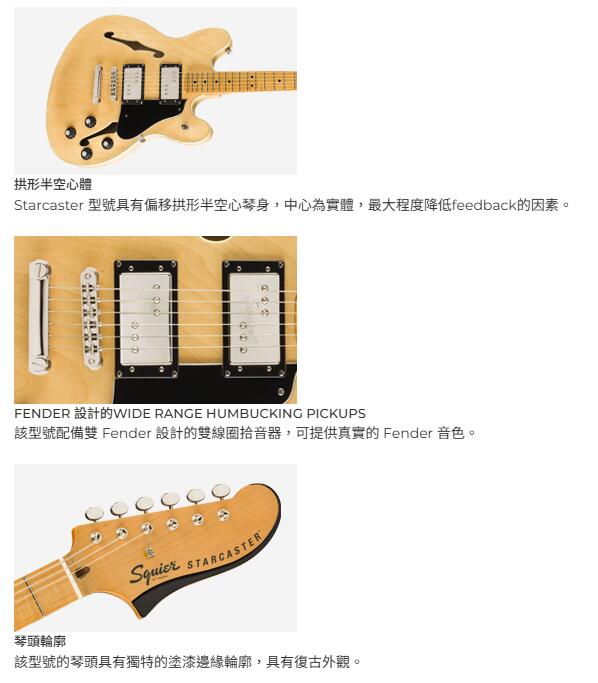 Starcaster 具有帶中心塊的偏置半空心體。它由層壓楓木製成,